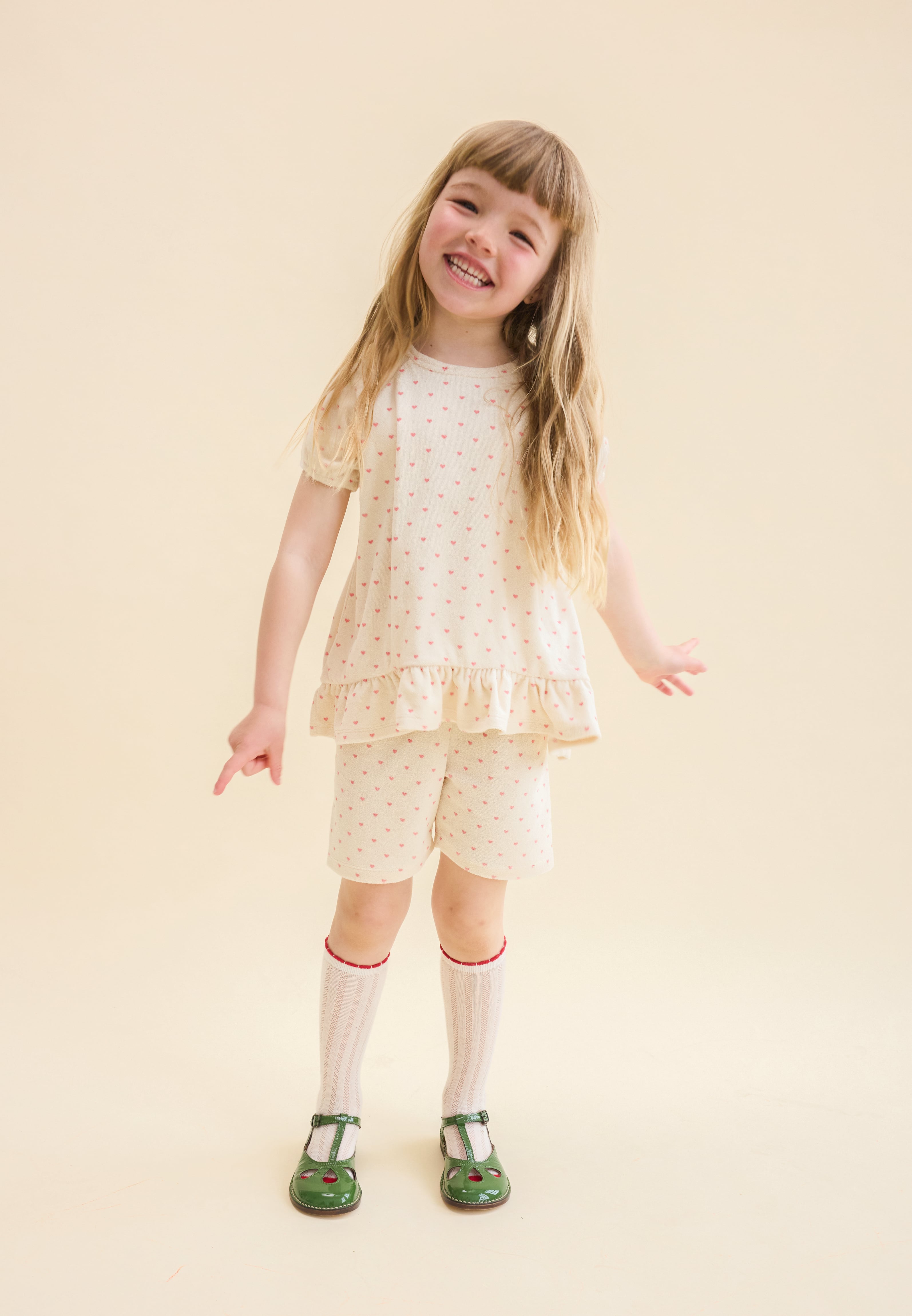 小さなハートを散りばめた愛らしいプリントが、コーディネートを優しく彩ります。