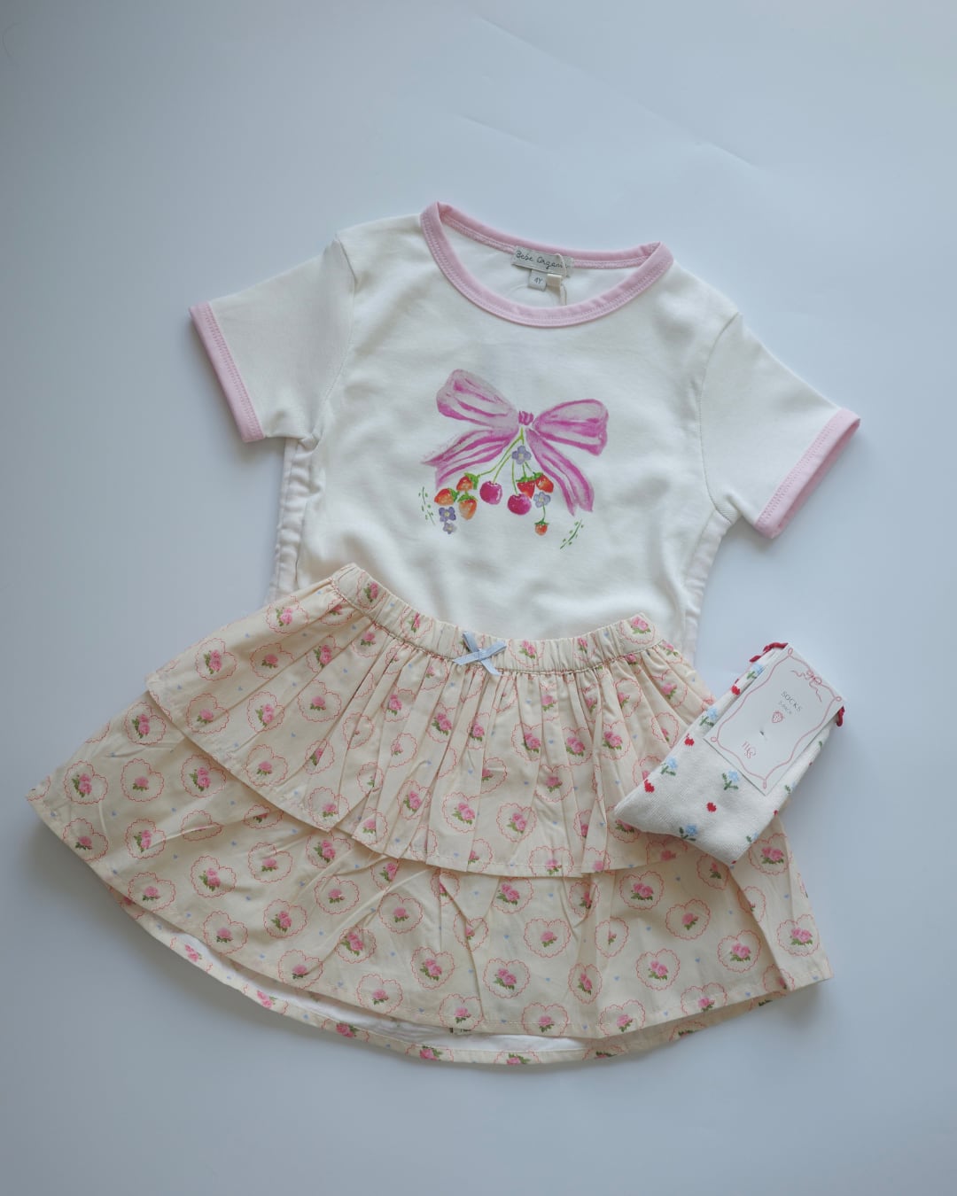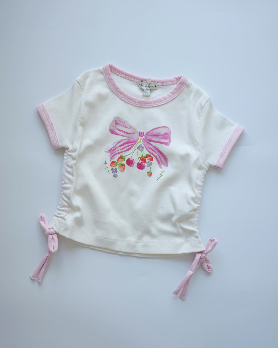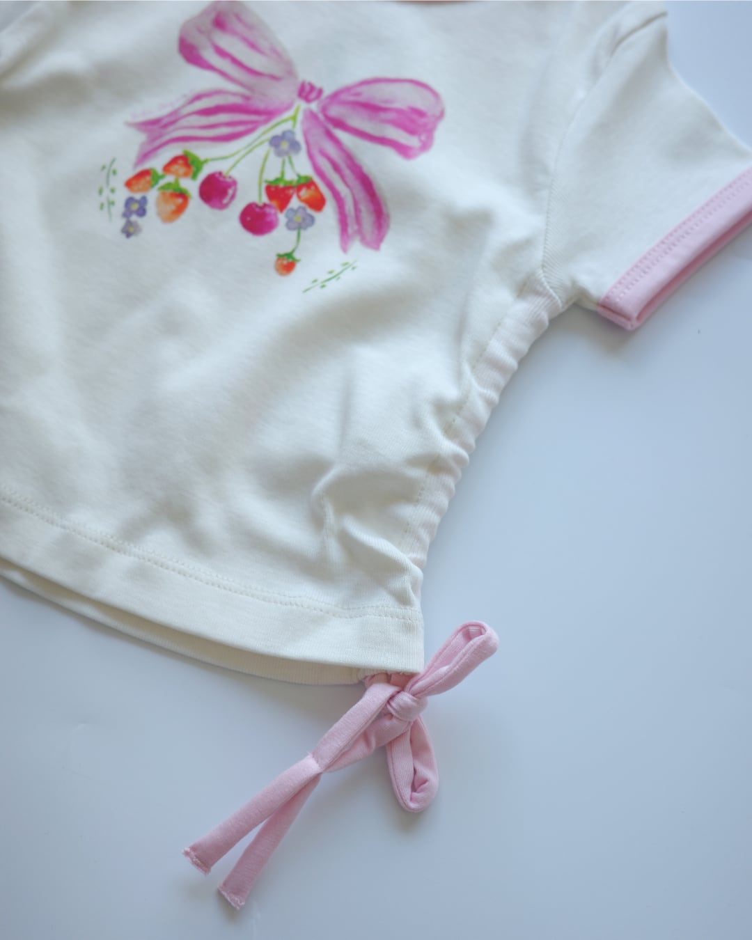 ▶︎ ピンクのリボンとフルーツプリントが愛らしく、サイドのリボンディテールがガーリーなアクセントに♡!