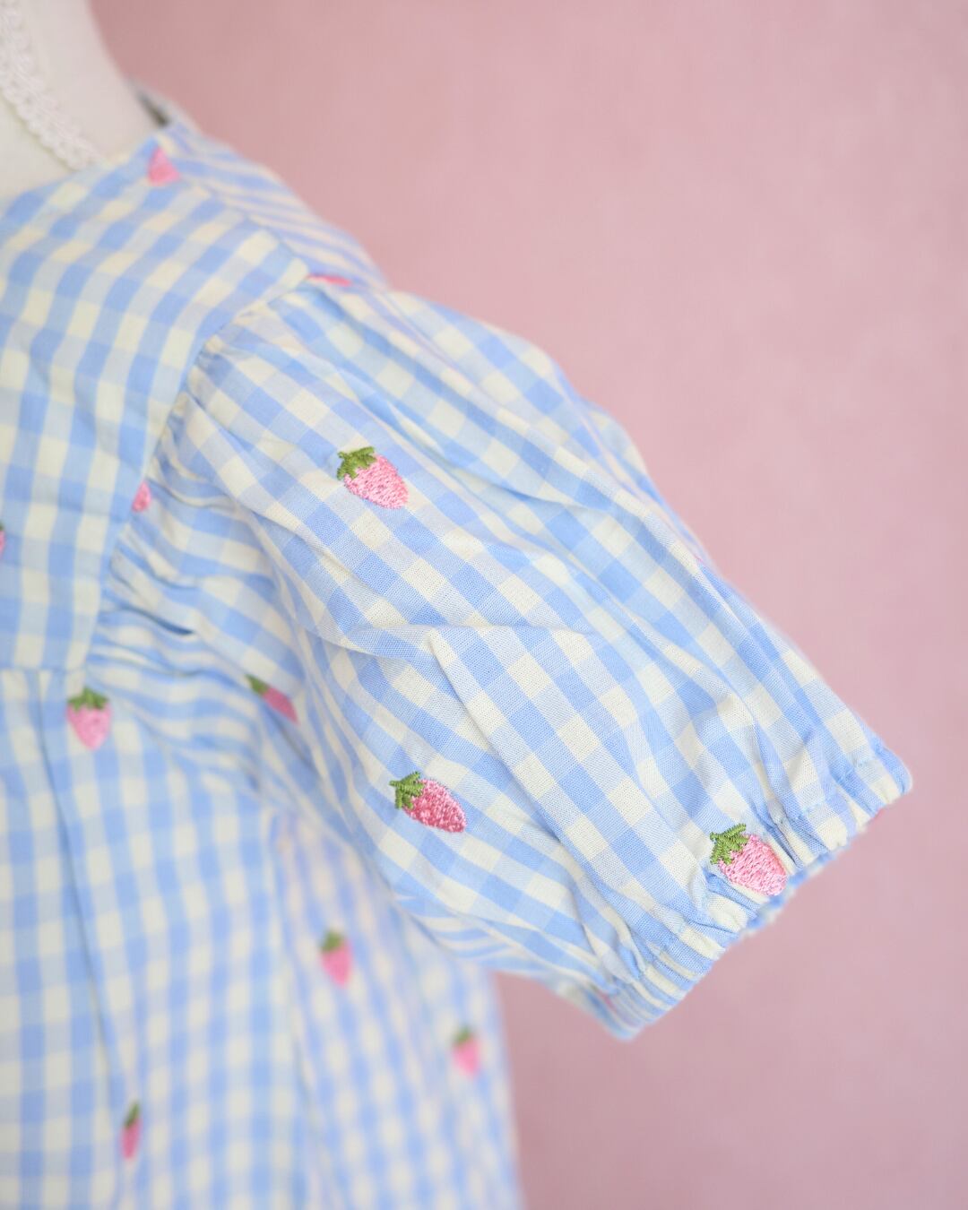 爽やかなギンガムチェックに可愛らしいいちご刺繍を散りばめたワンピース。