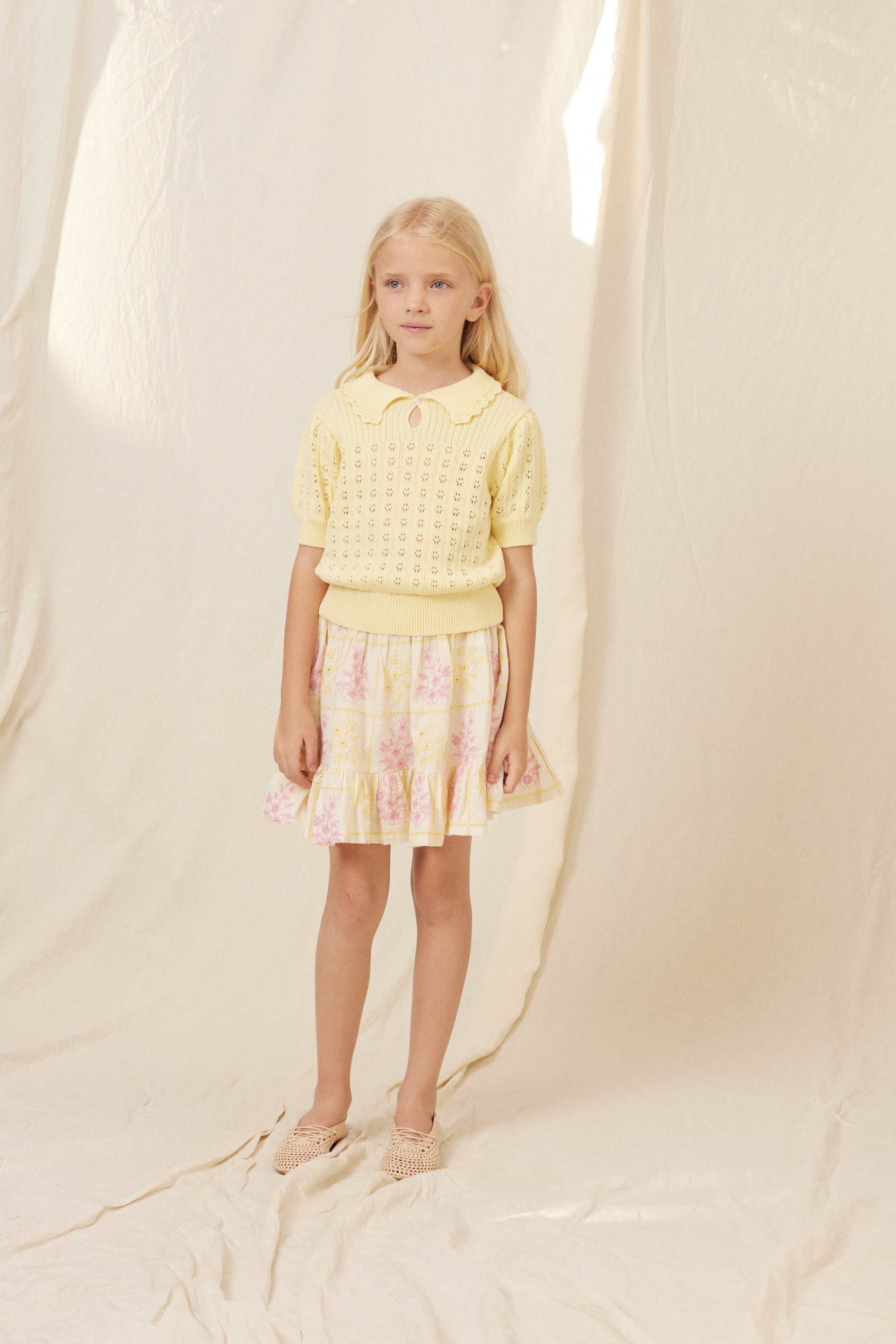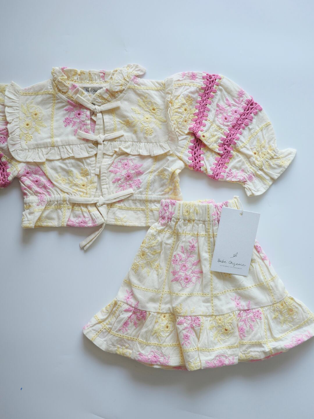 淡いイエローベースにピンクの花柄が映え、春夏コーデにぴったりの一枚です◎